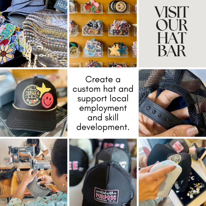 Check out our Gift Shop and Hat Bar! Everything is made and manufactured by students and staff in our sewing and training center.